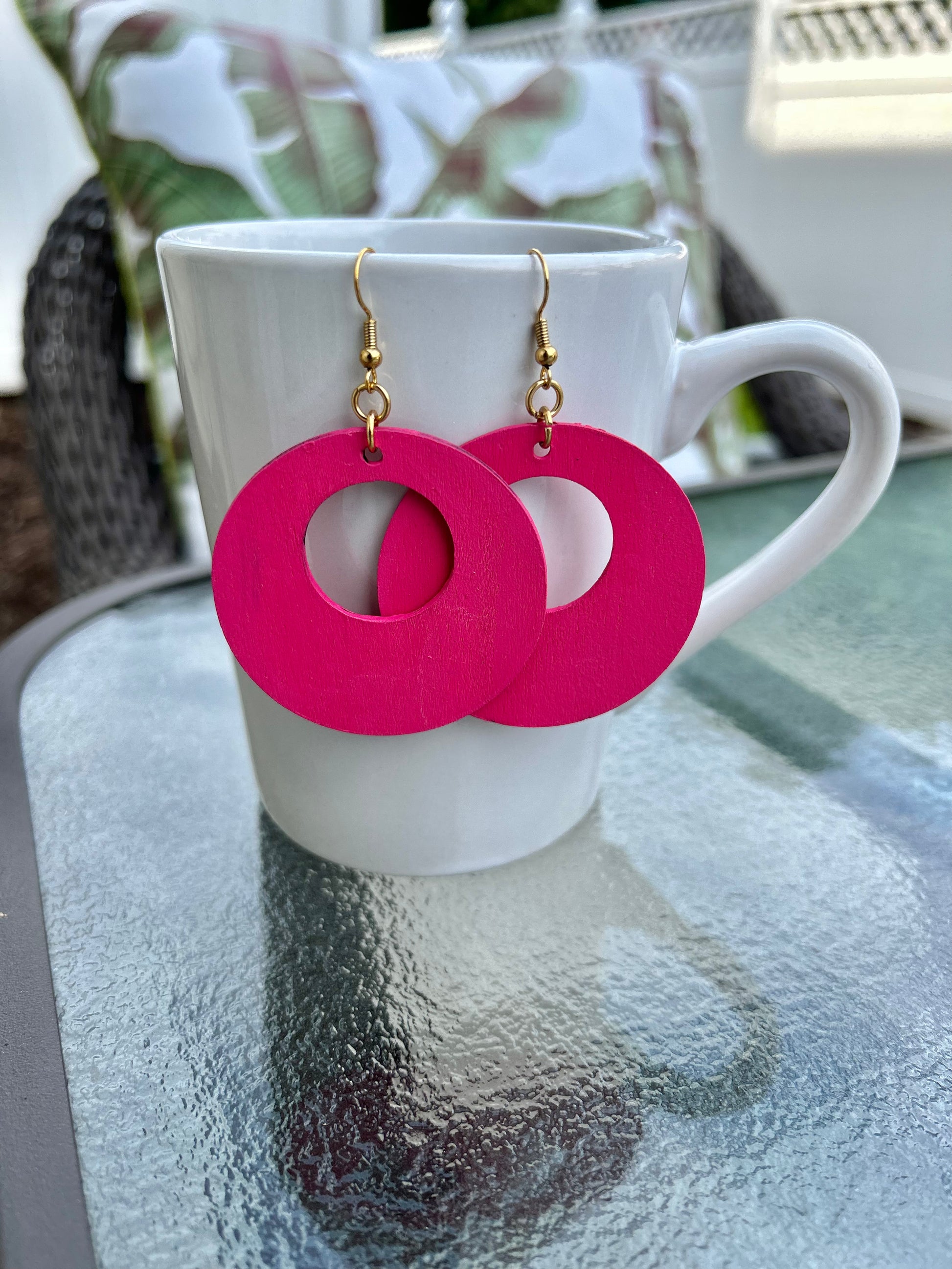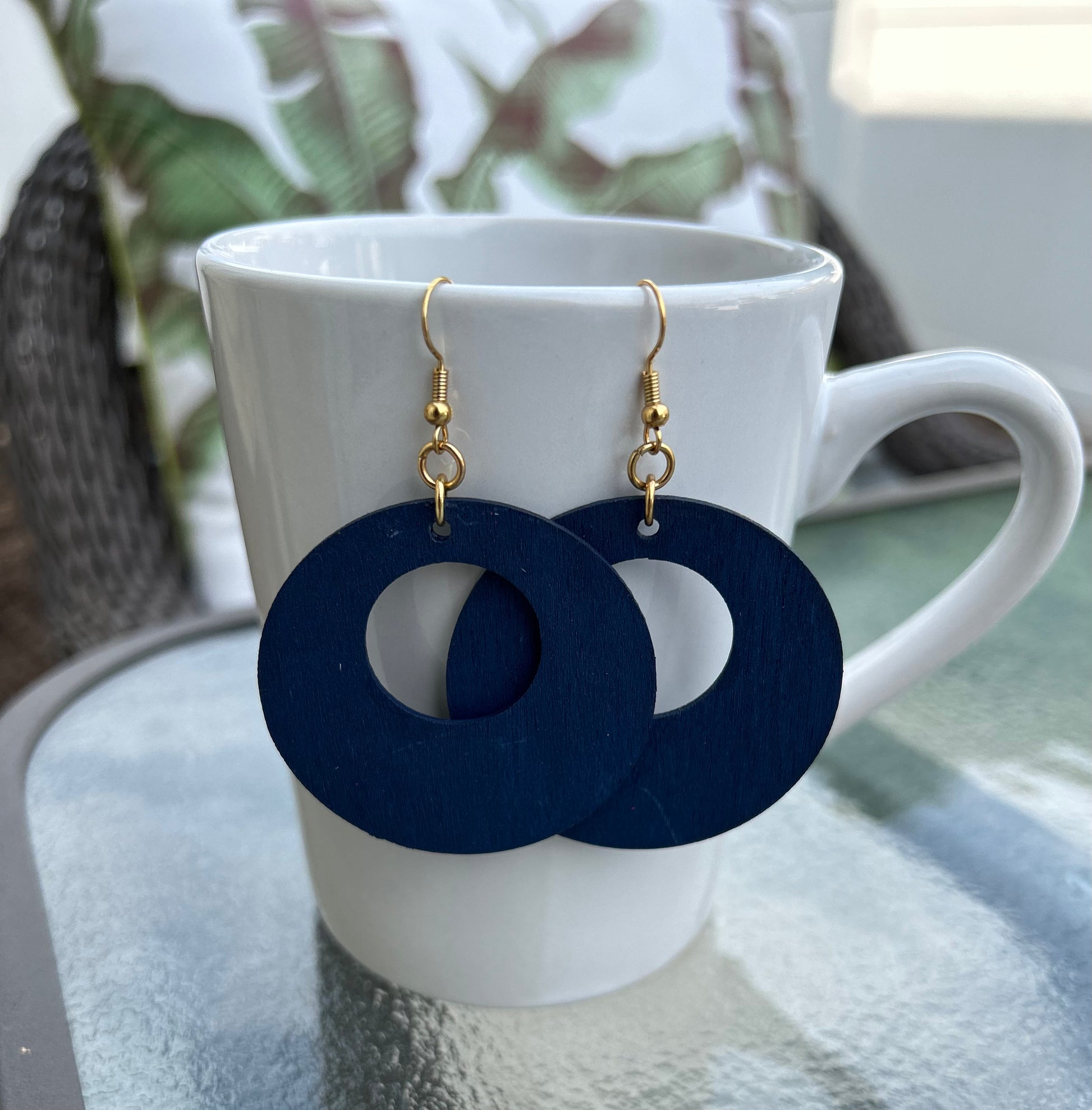 These 2” wood hand painted hollow circle earrings with gold plated ear wires are available in navy blue and hot pink.