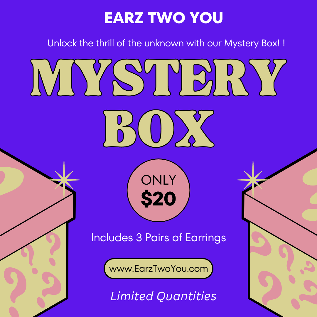 Unlock a world of style and surprise with our exclusive $20 Mystery Box! Perfect for those who love a little mystery and a lot of sparkle, this box contains 3 unique pairs of earrings personally selected by us from our collection at Earz Two You.