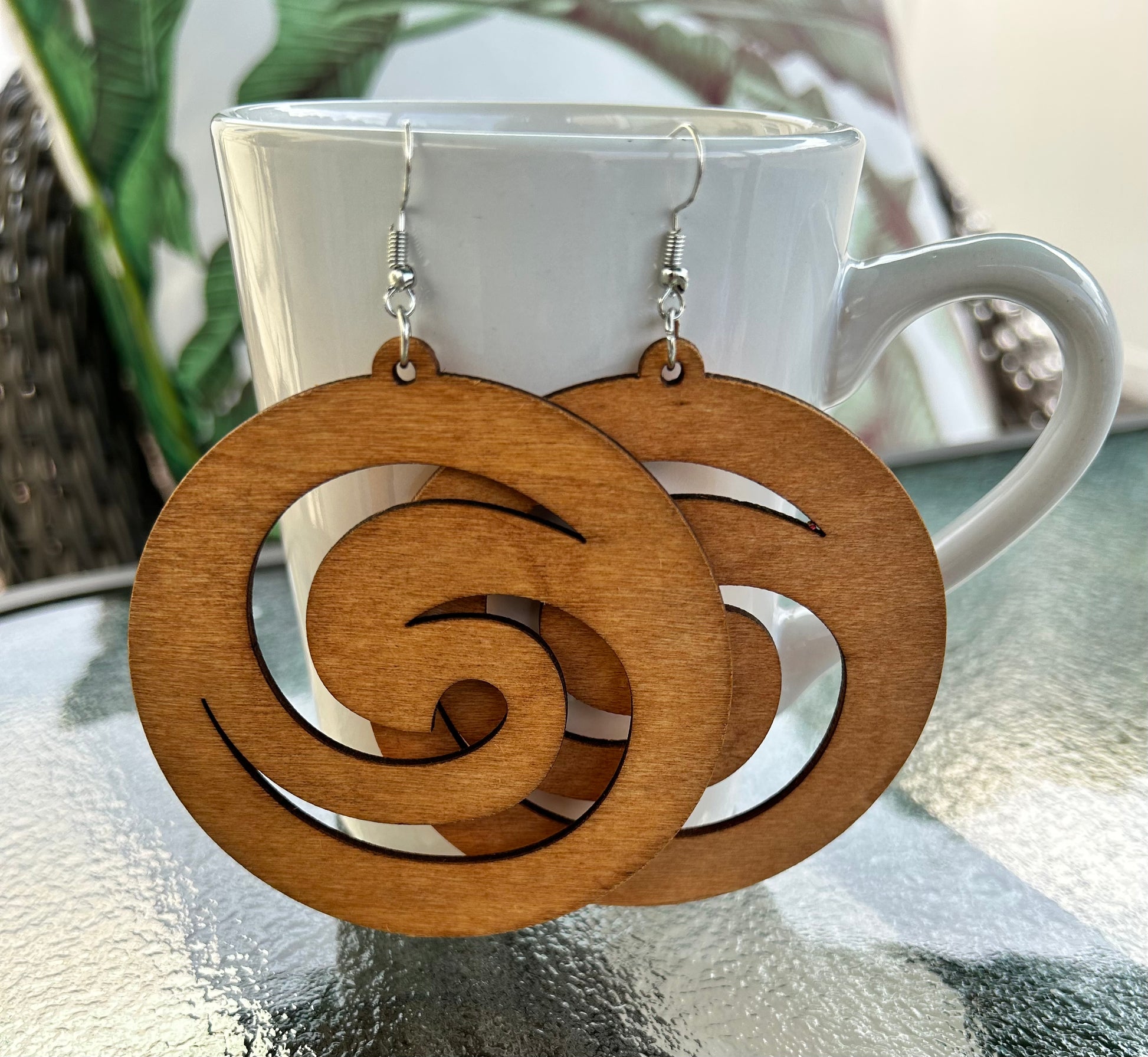 The 3” wood circle wave dangles are very lightweight, cute, and fun. They are available in black, dark brown and tan.