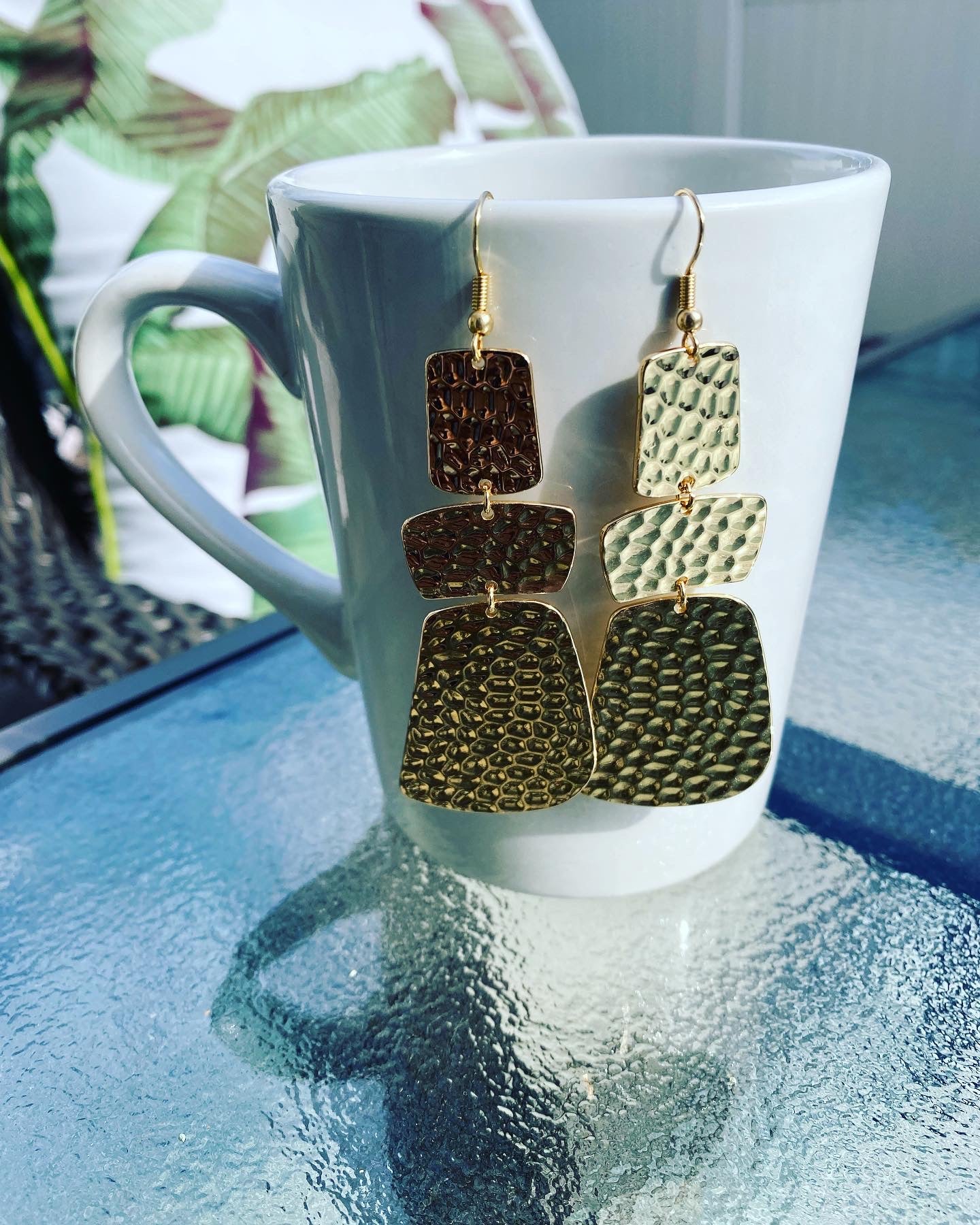 The geometric hammered dangles are cute and fun. Great with a cute casual everyday look.