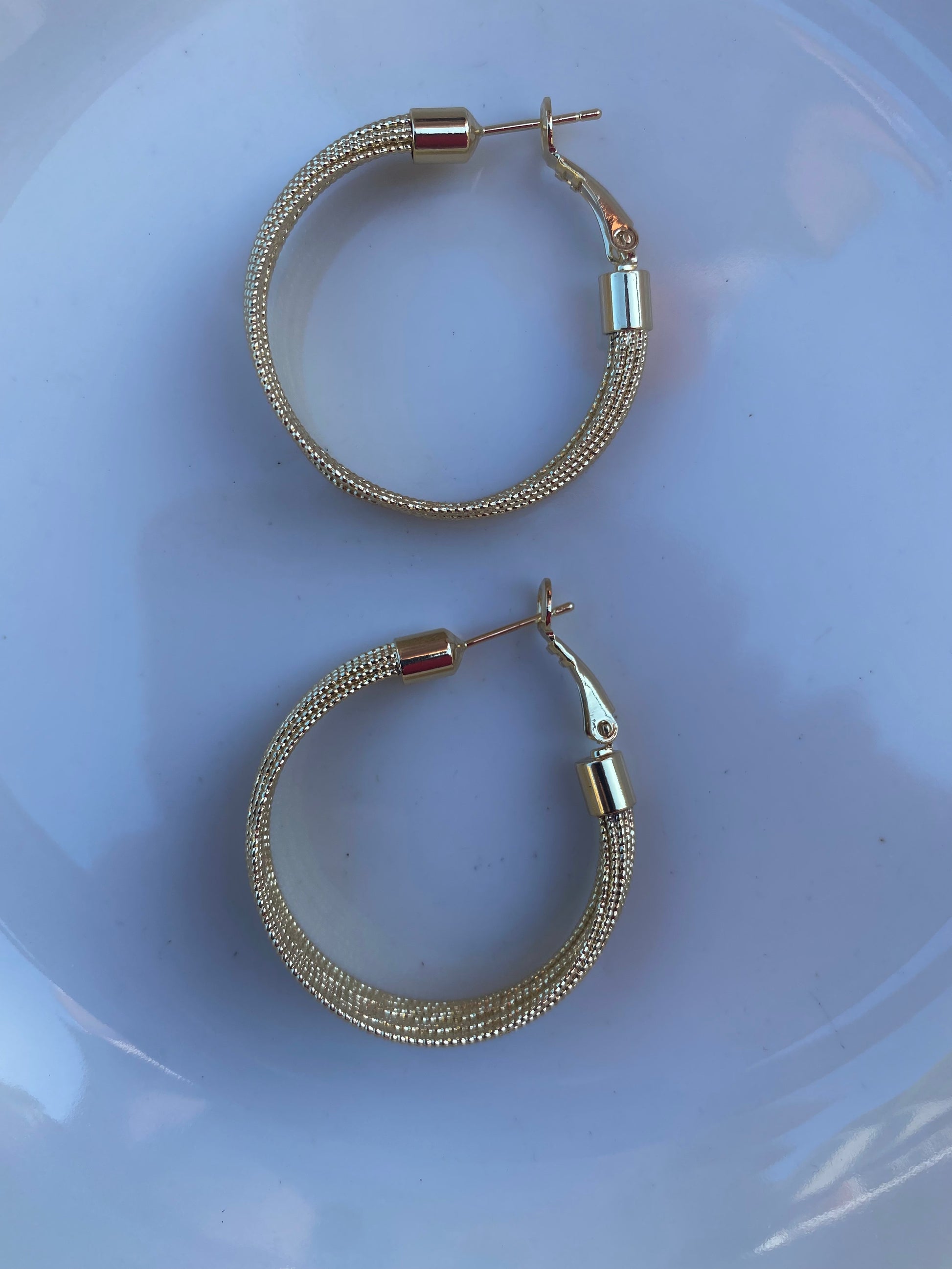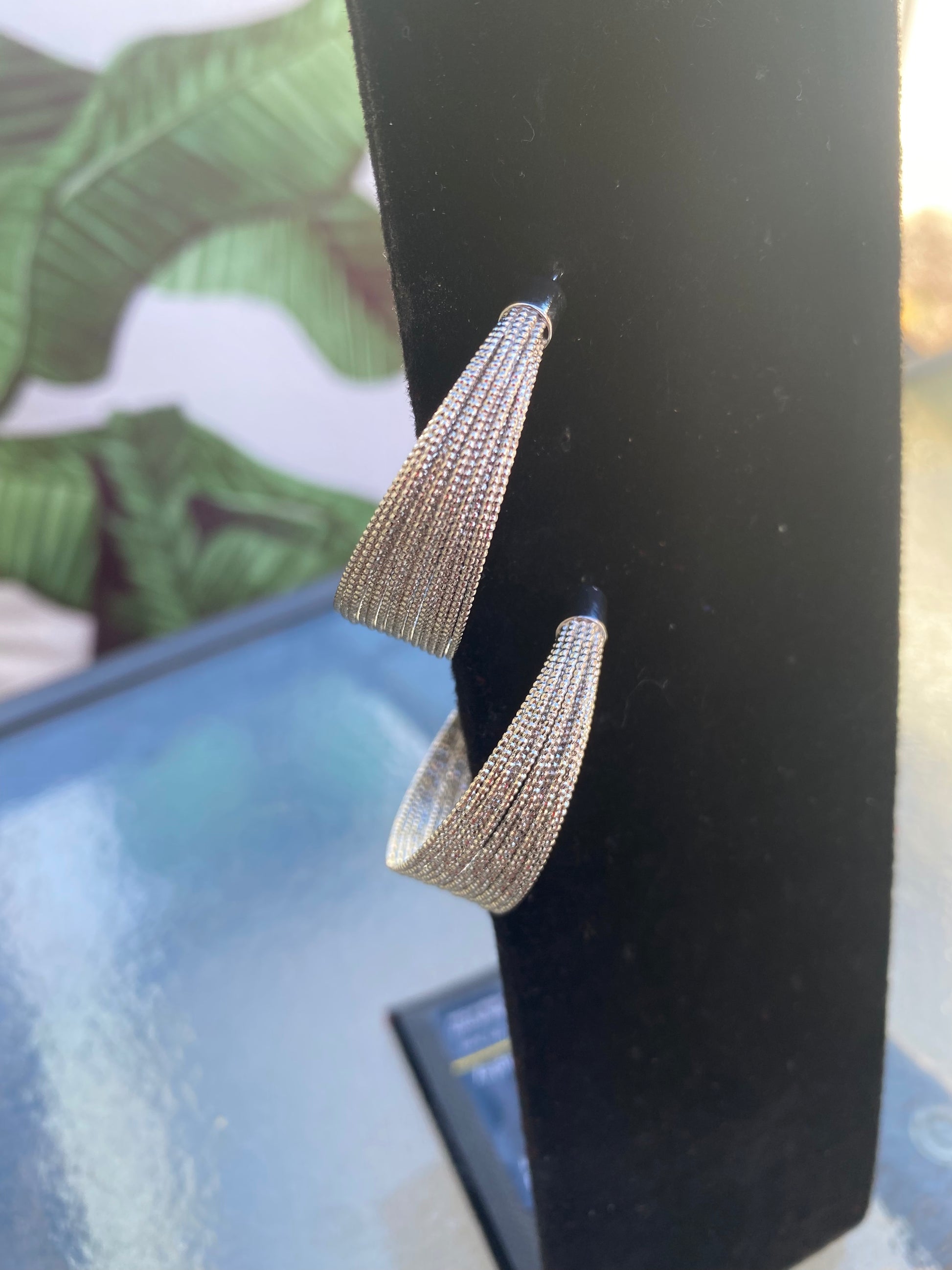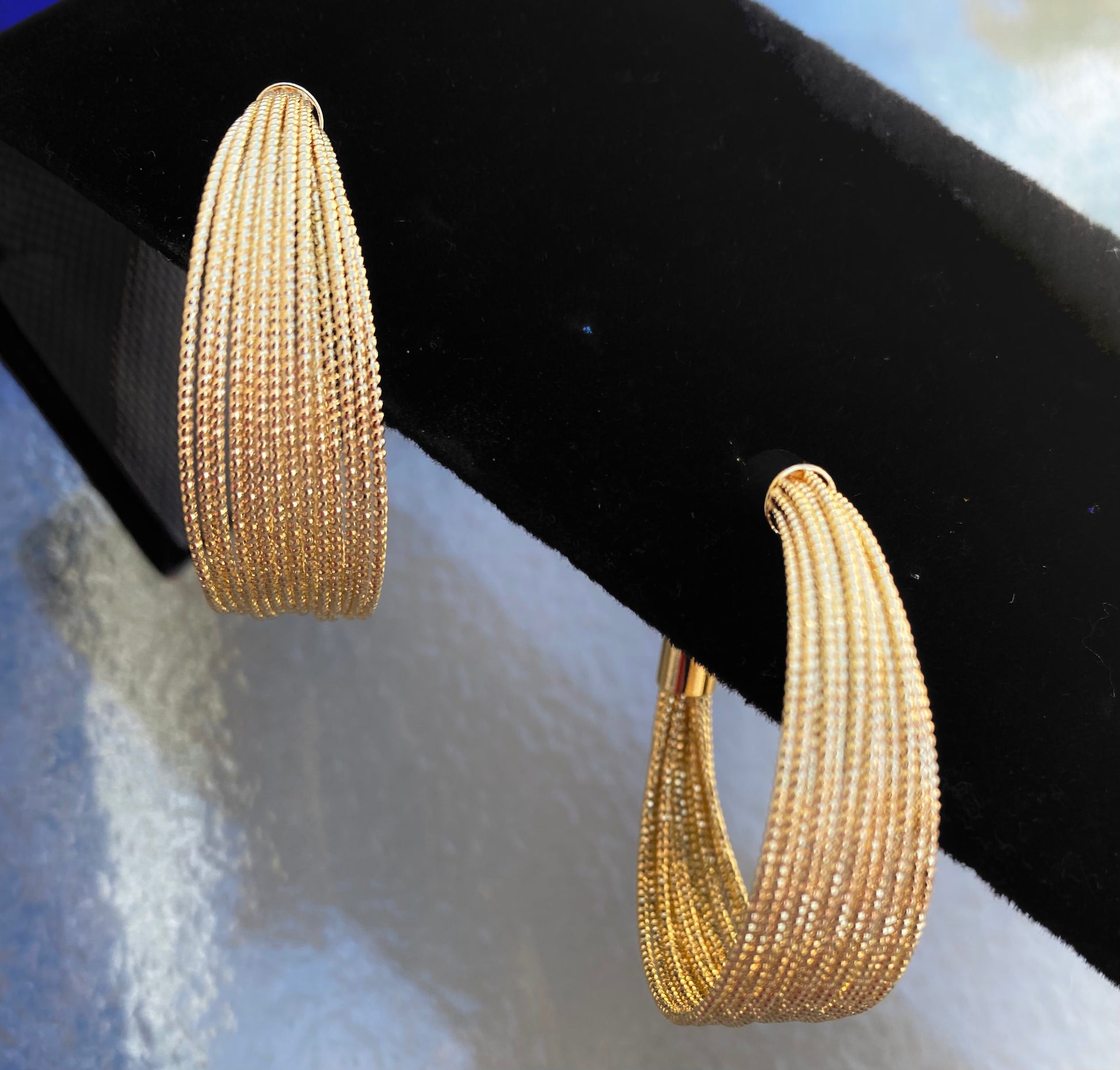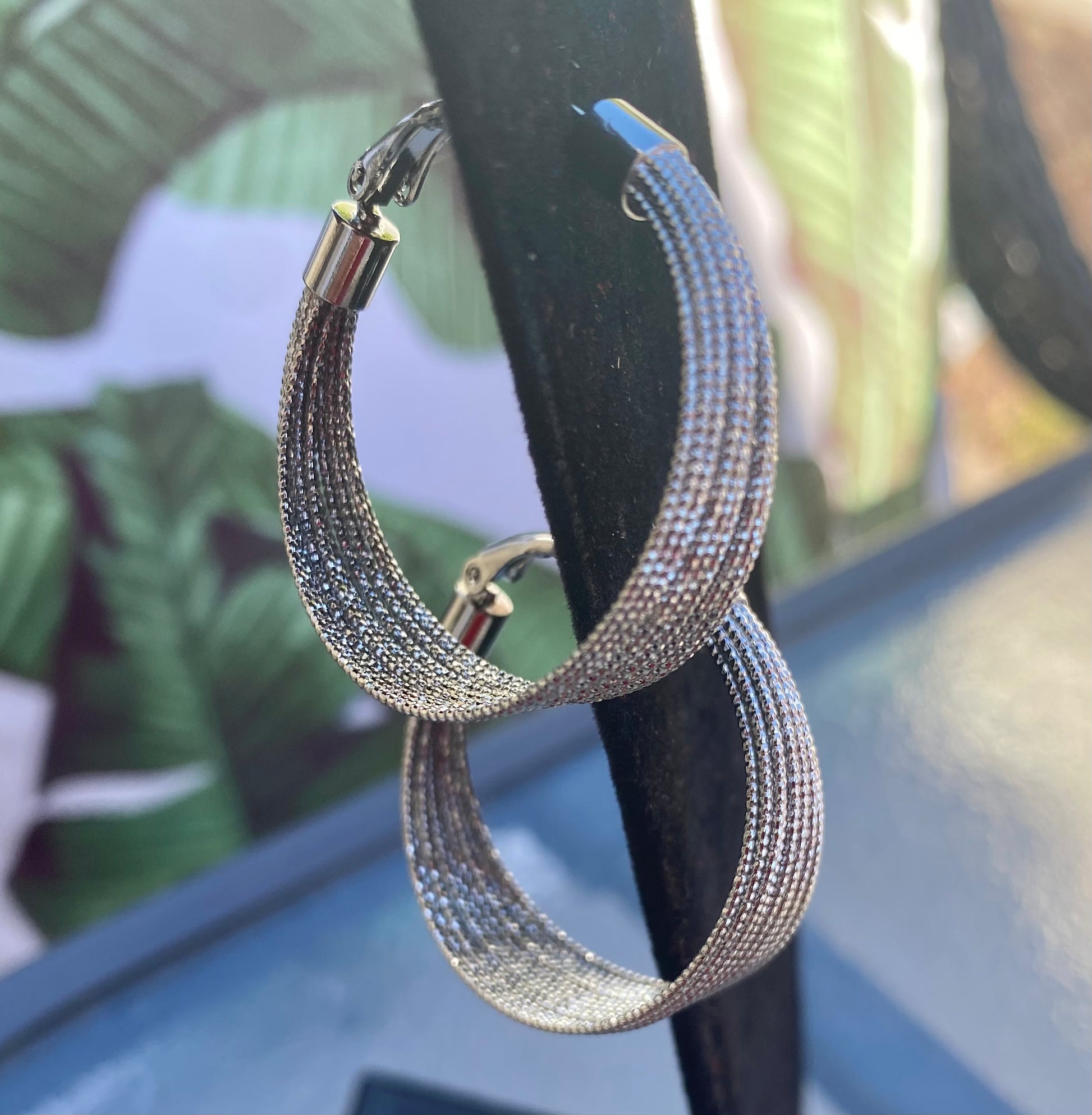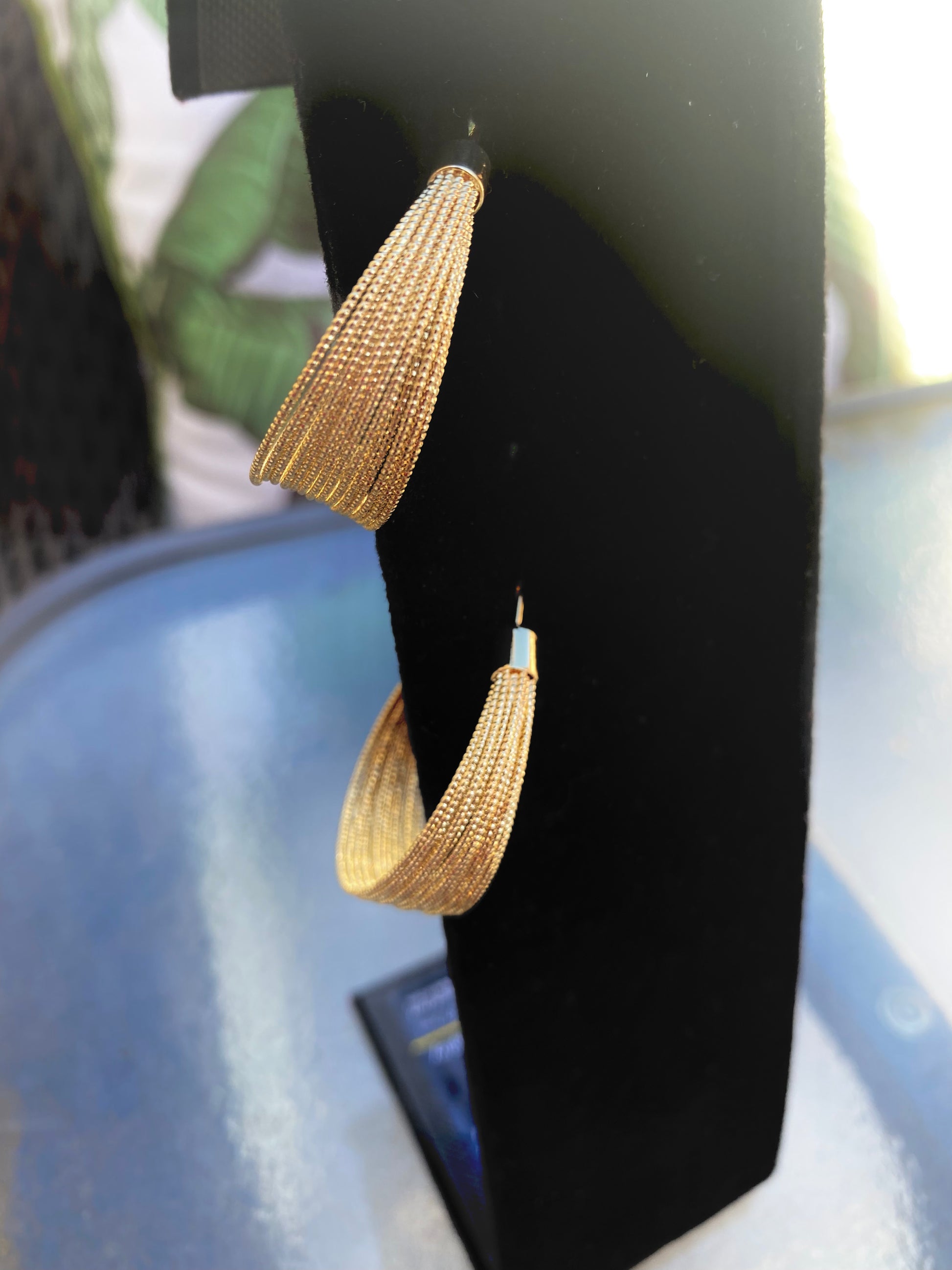 The multi-strand wire hoop earrings are made with strands of wire that form a hoop. These earrings are beautiful and definitely not your average hoop. The are available in both gold and silver.