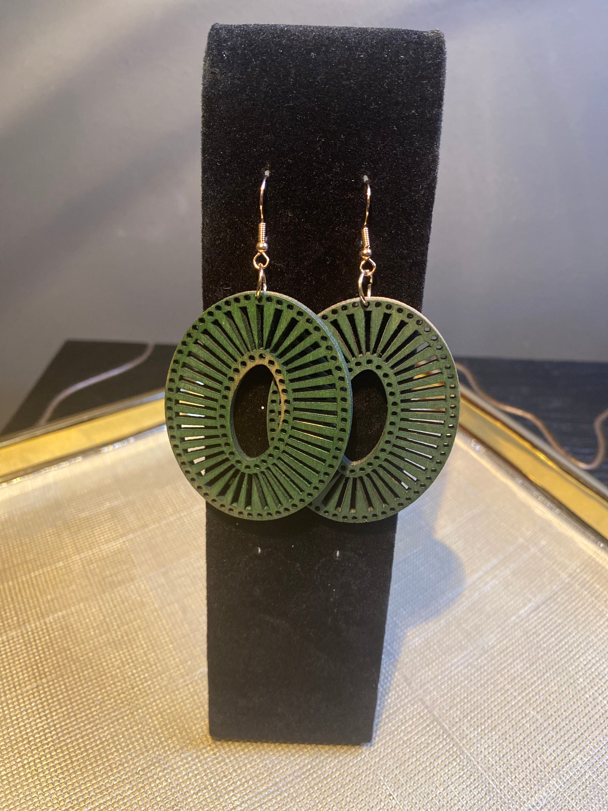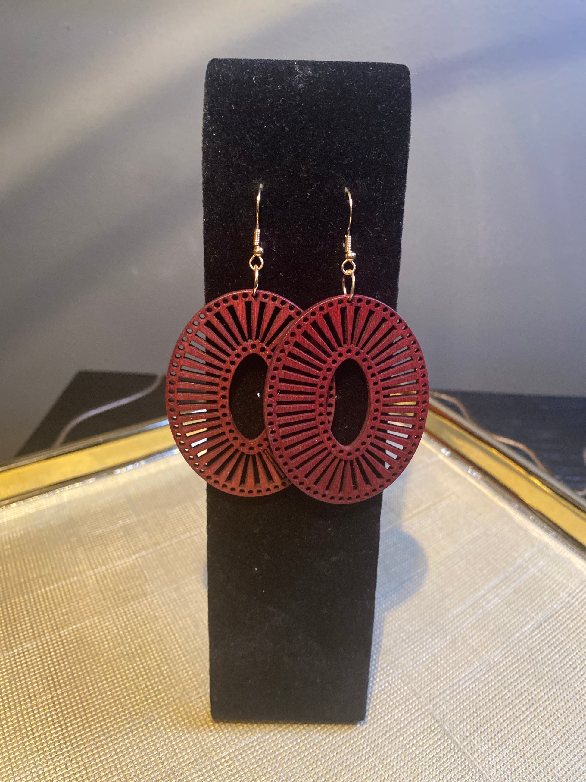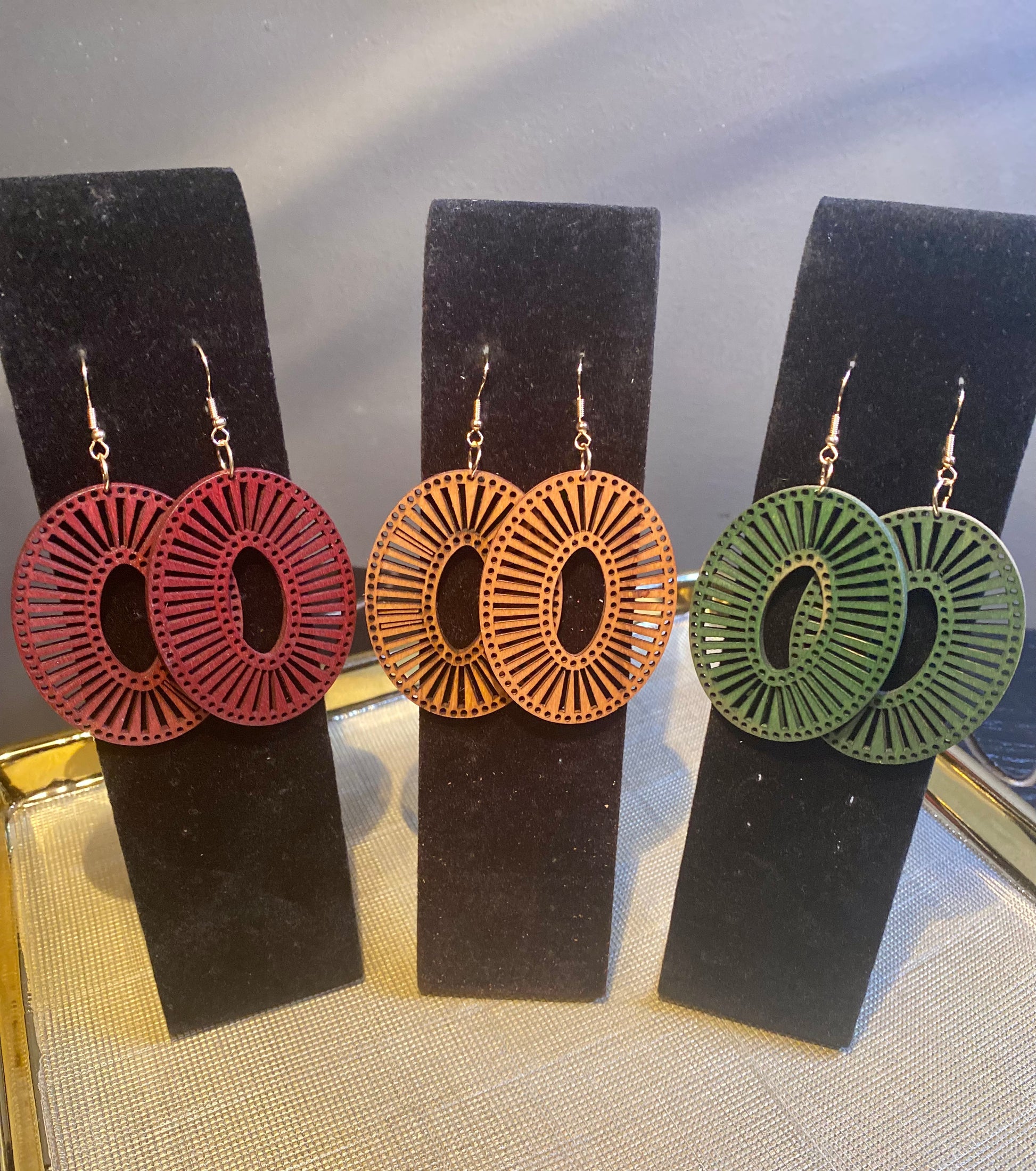 The oval wooden round dangles are cute and lightweight. Available in red, brown, and green
