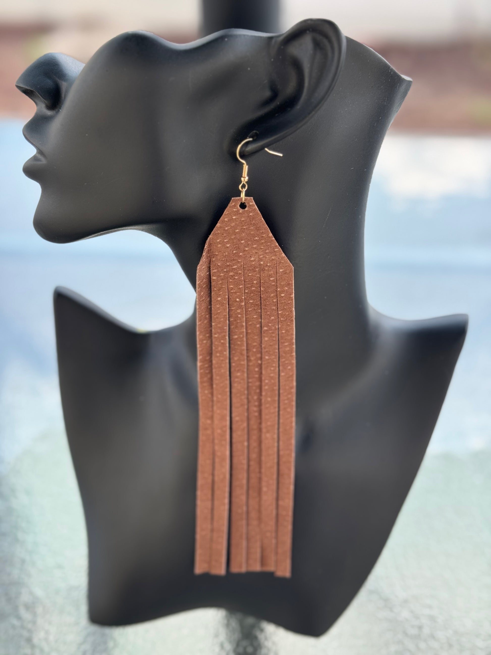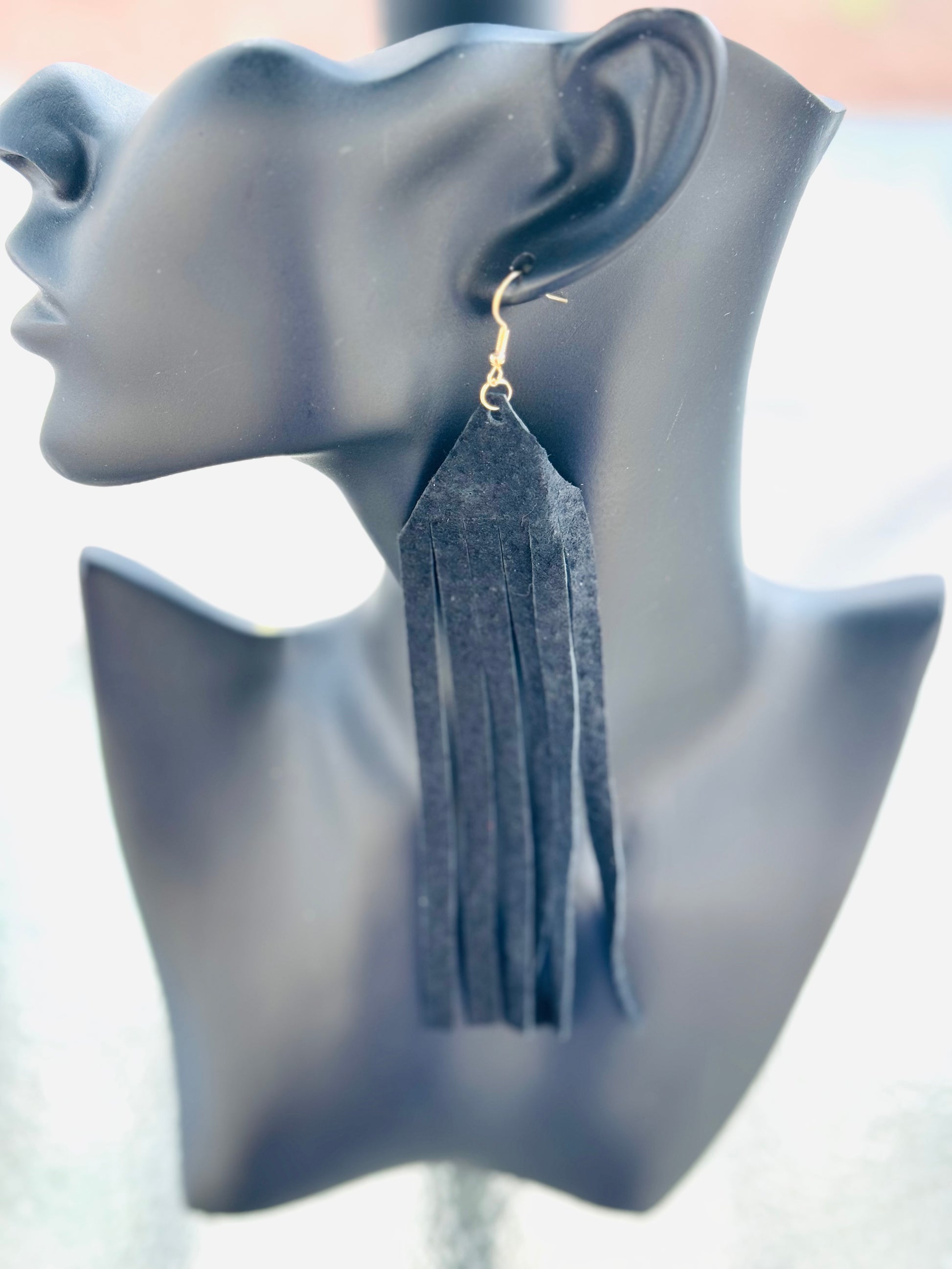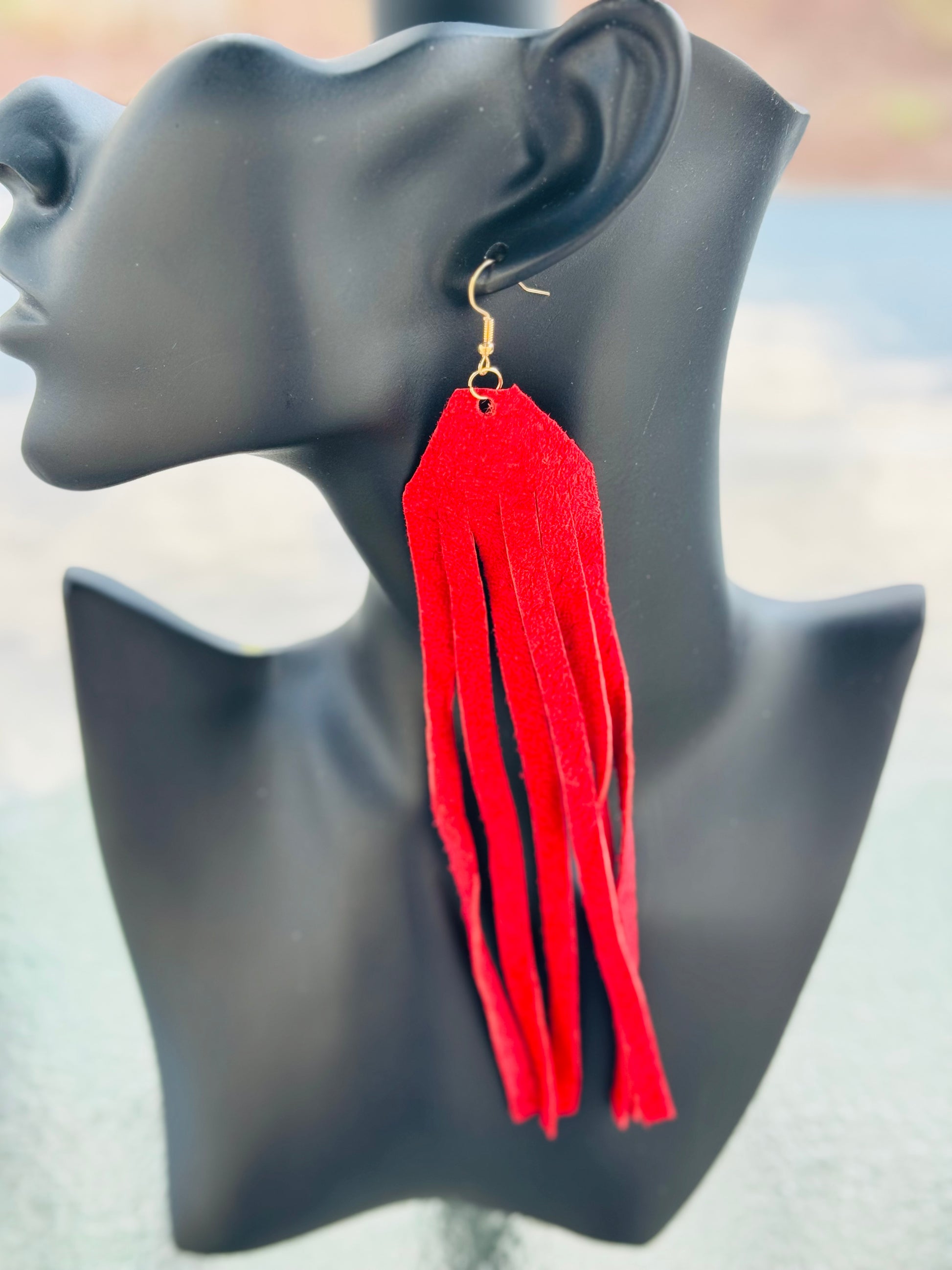 Turn heads with these bold and elegant 100% suede fringe earrings, available in classic black, vibrant red, and rich brown. Each pair is handmade with care, featuring long, flowing suede tassels that make a statement without weighing you down.