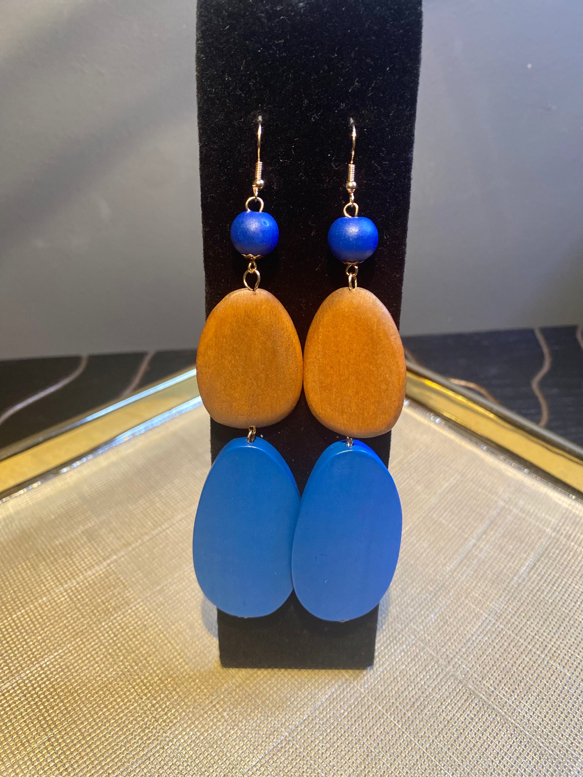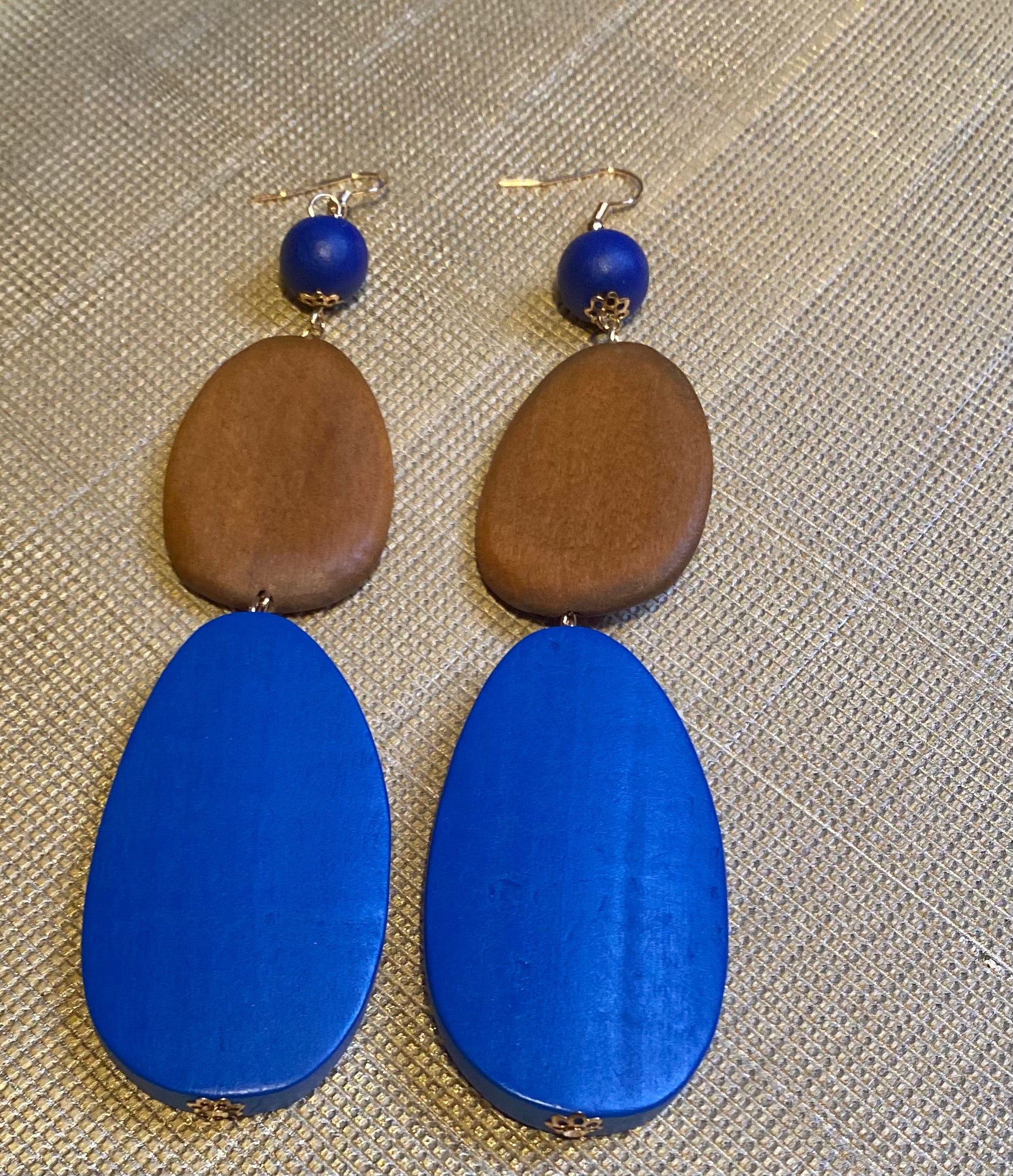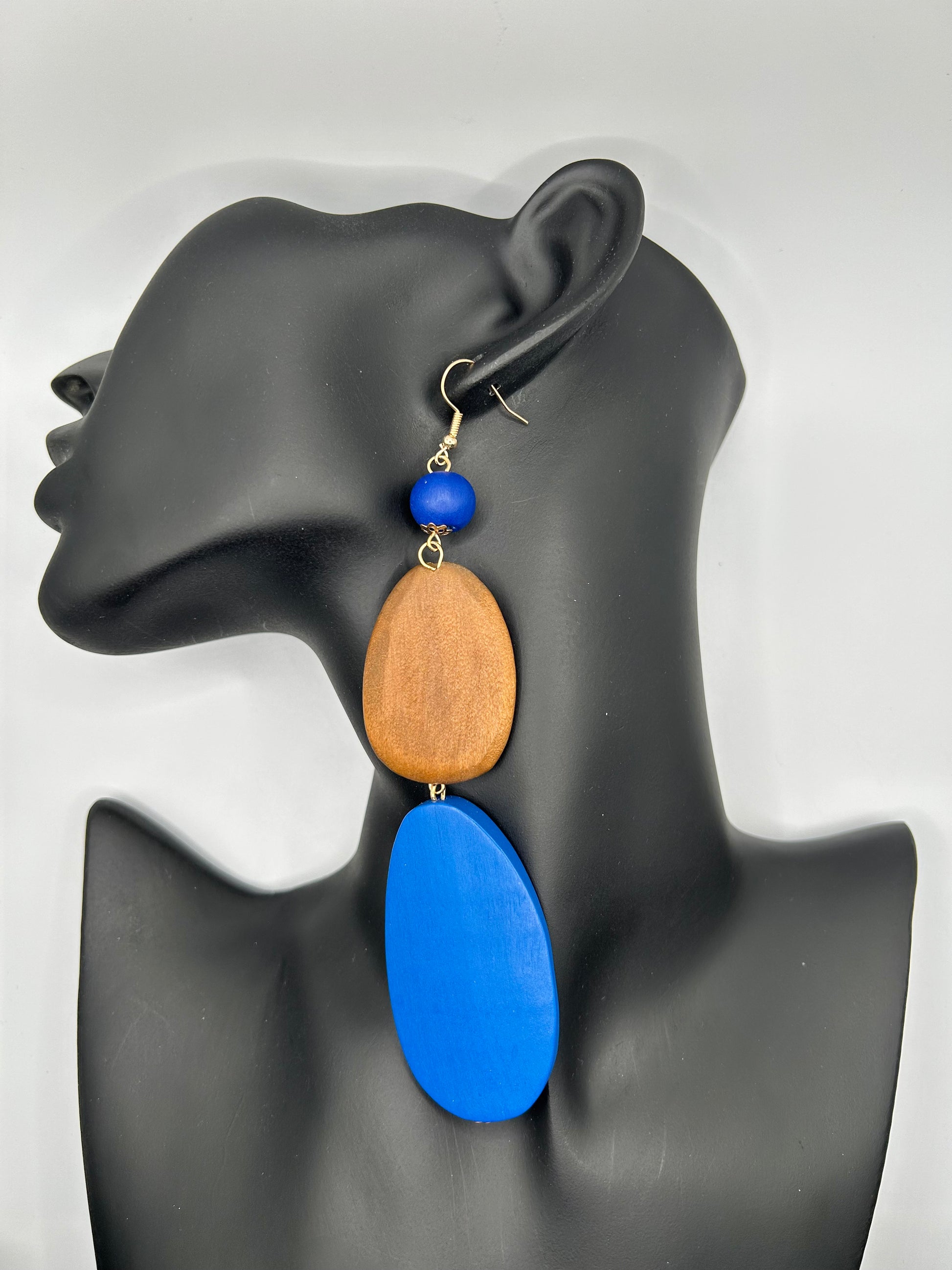 The blue and natural color block wooden earrings are bold statement pieces that are sure to get your noticed.