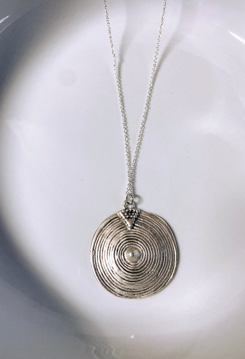 The tribal spiral necklace has an antique silver plated charm and is a statement piece that will make you stand out in any crowd.