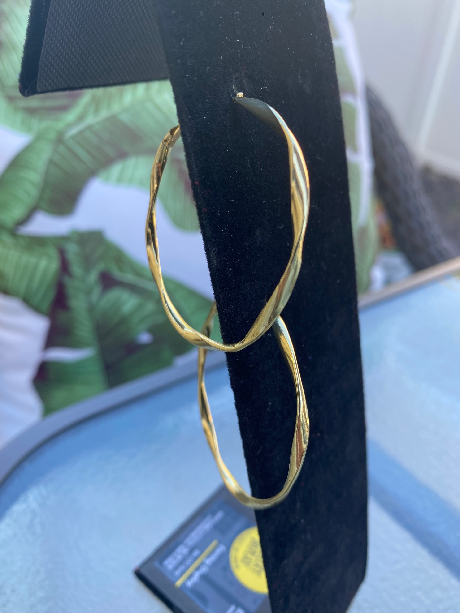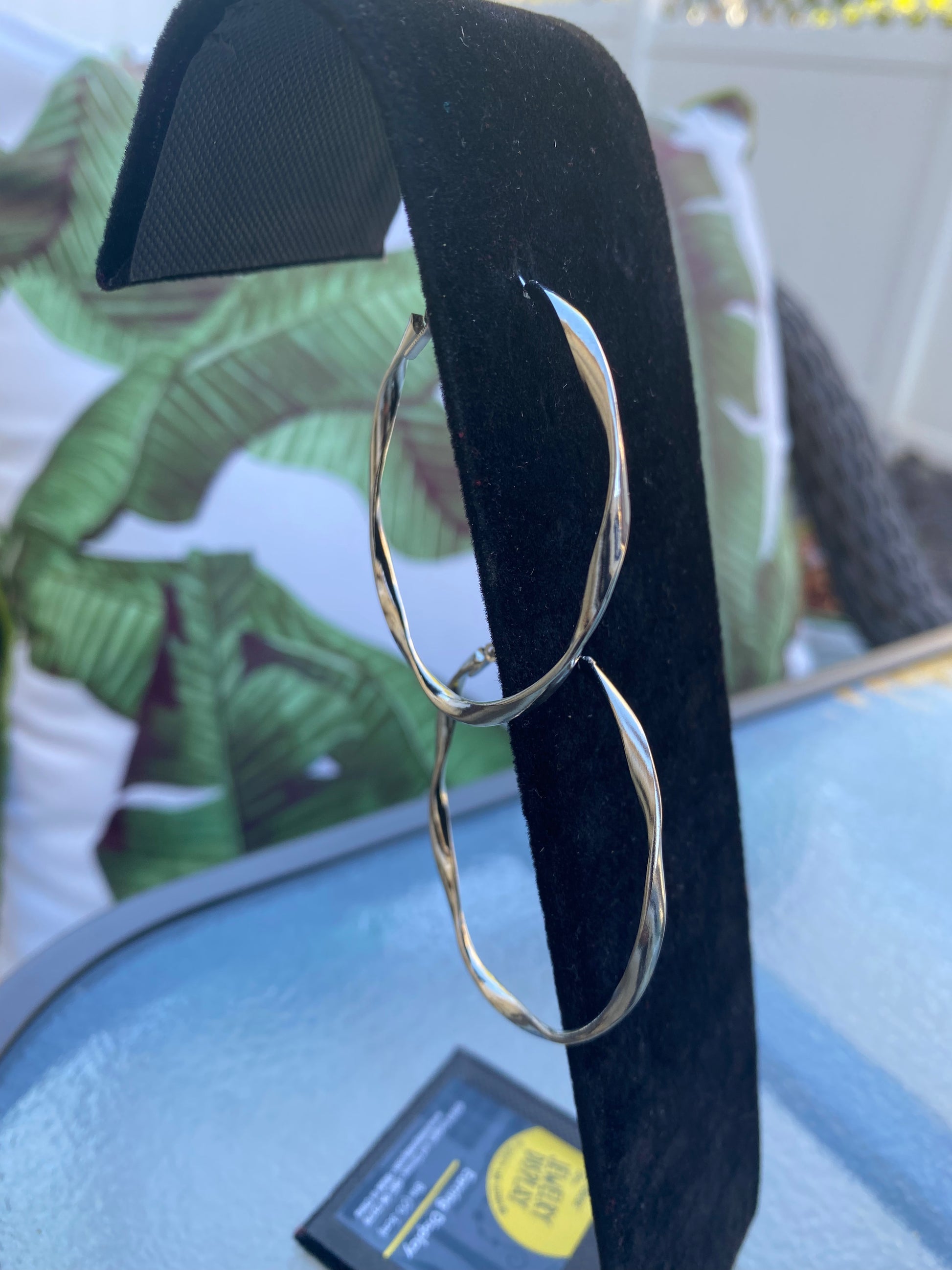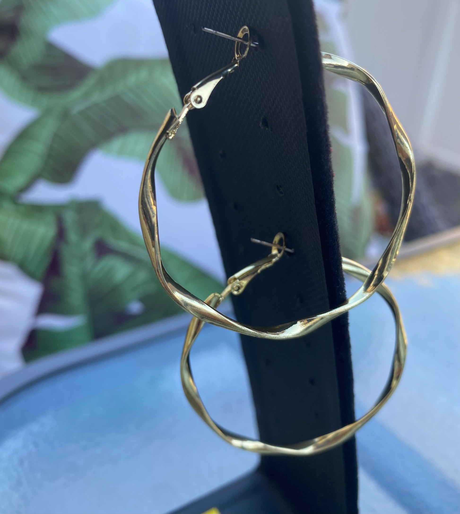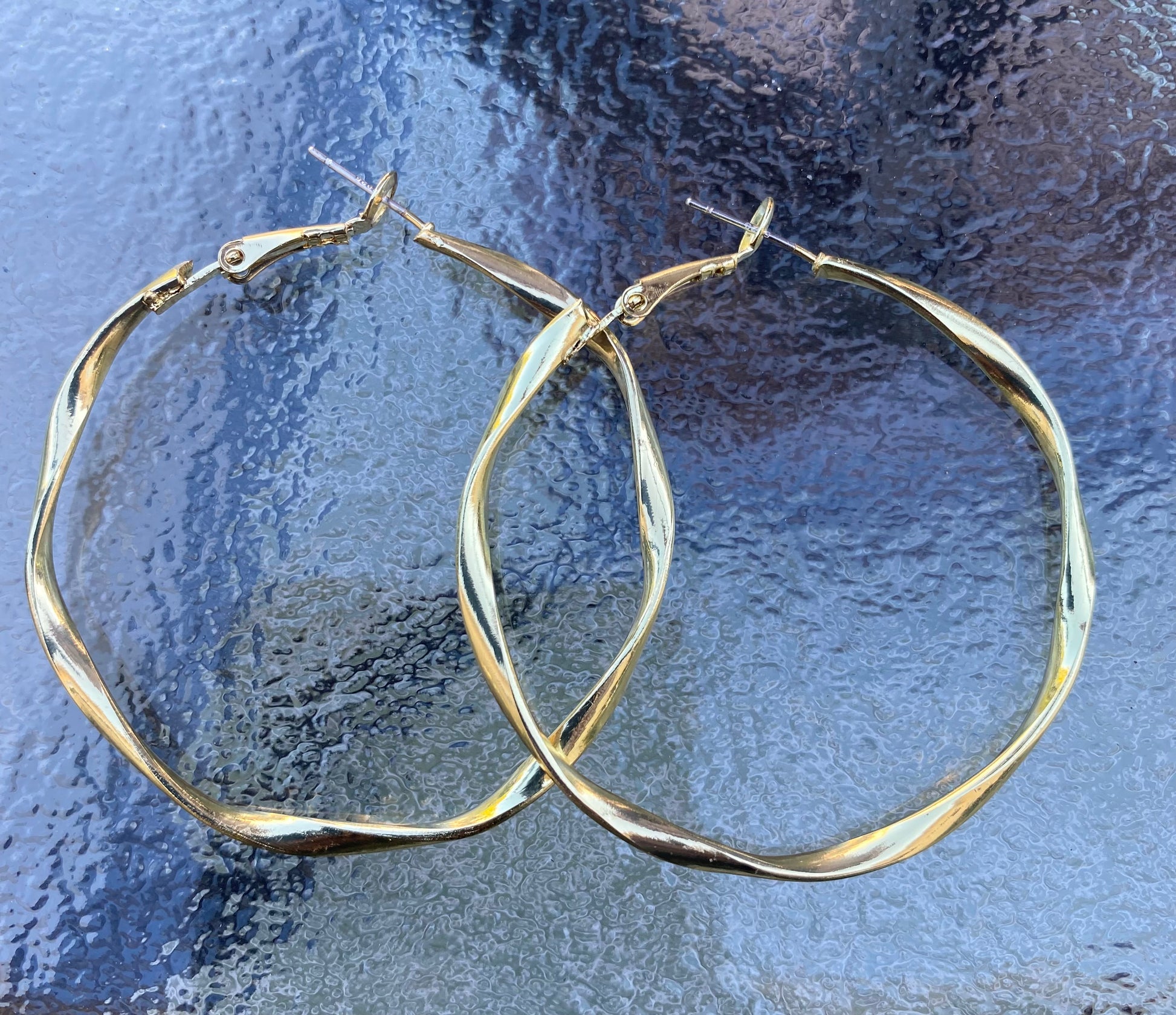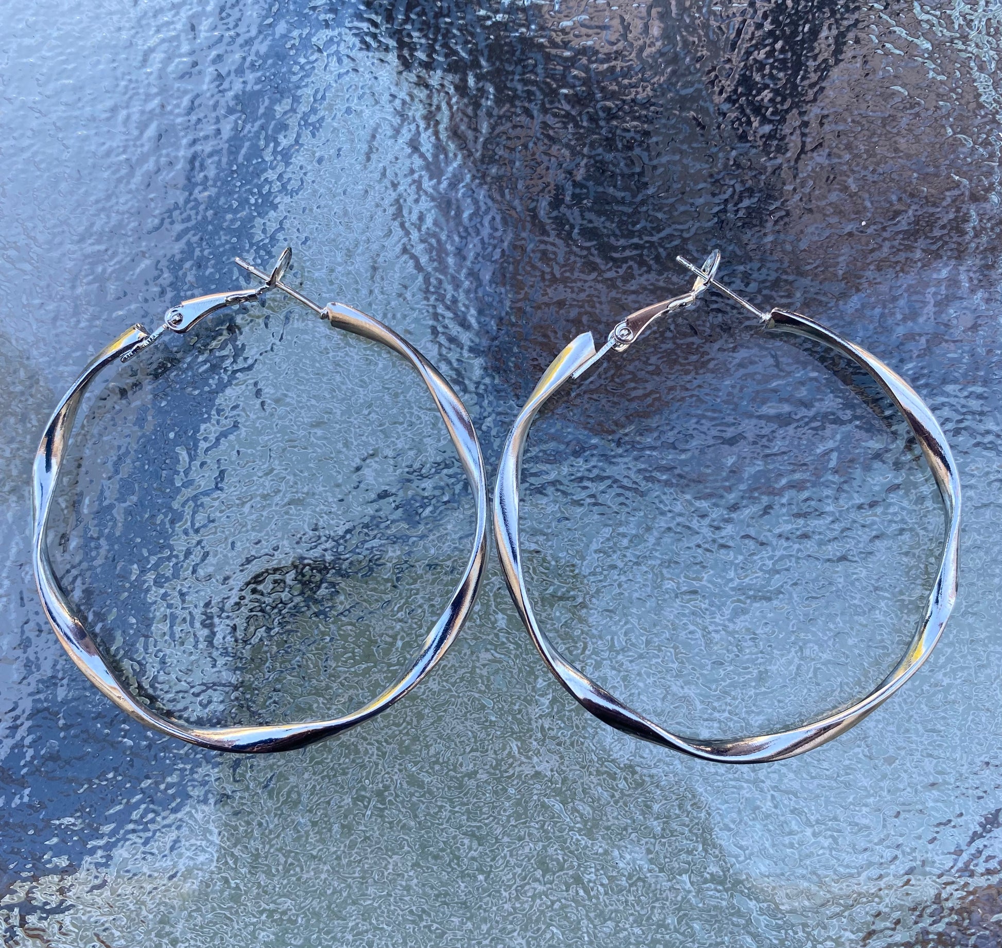 The 40mm twisted hoops are perfect for everyday wear. They are available in gold and silver.